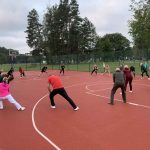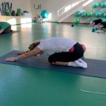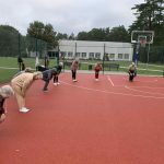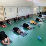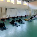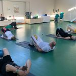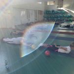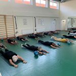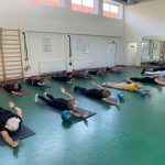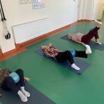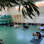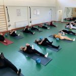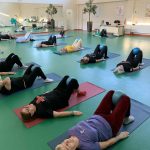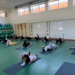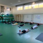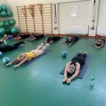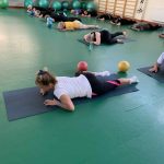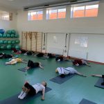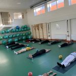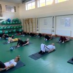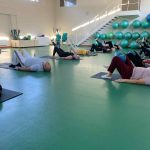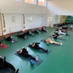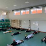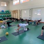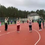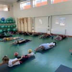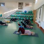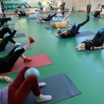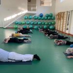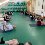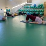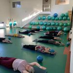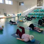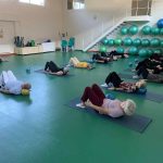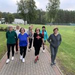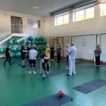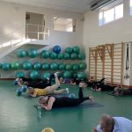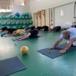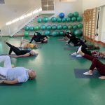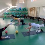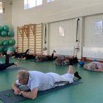 Fizinio aktyvumo programa tęsėsi ir salėje – čia dalyviai atliko tempimo, lankstumo bei pusiausvyros pratimus, dirbo su gimnastikos kamuoliais. Akcentuotas saugus judėjimas: dalyviai buvo skatinami įsiklausyti į savo kūną ir pratimus atlikti pagal individualias galimybes.